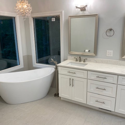 This light, clean space has a stand-up shower with a large vanity area. Check out the flooring!